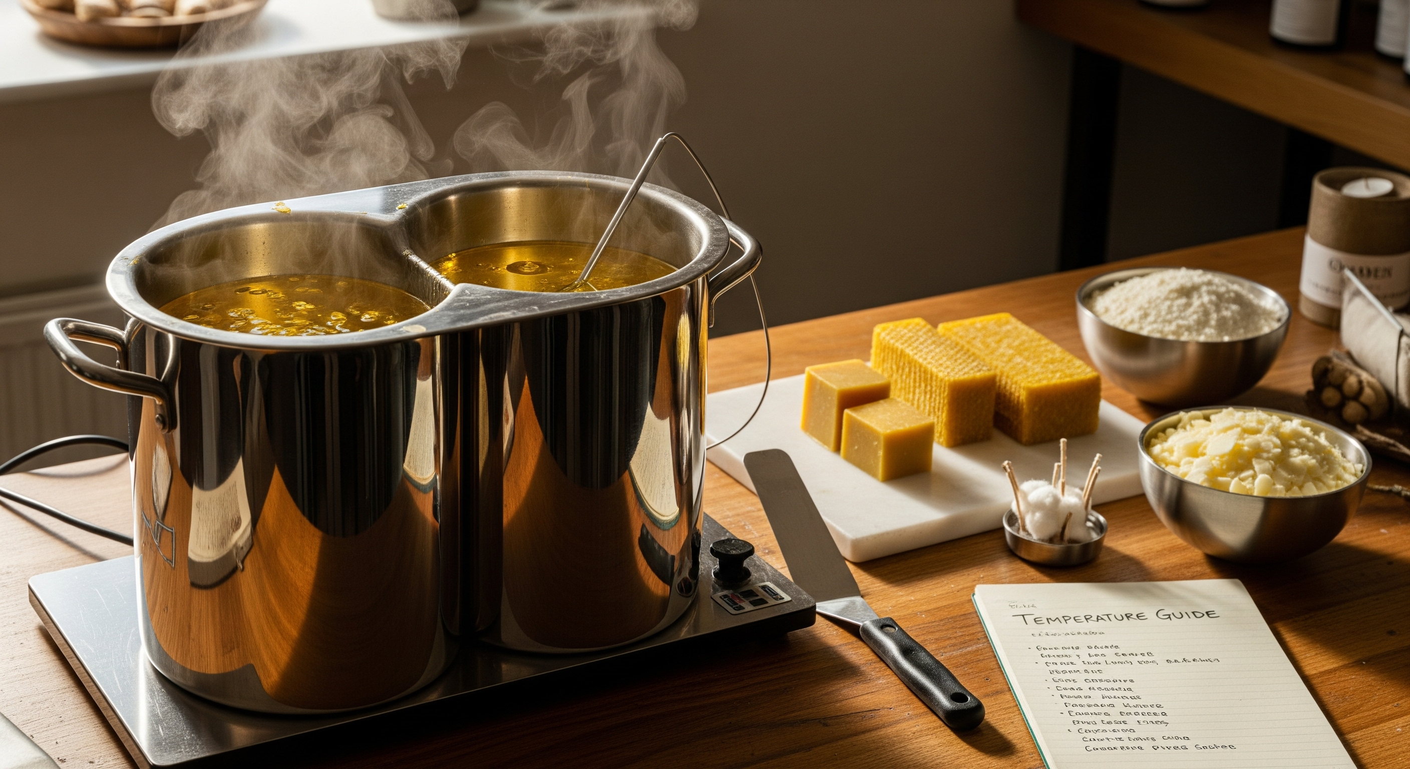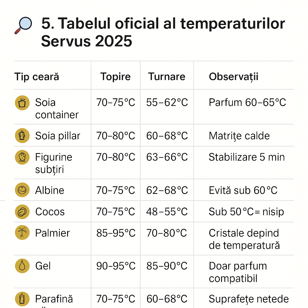Tip ceară Topire Turnare Observații Soia container 70–75°C 55–62°C Parfum 60–65°C Soia pillar 70–80°C 60–68°C Matrițe calde Figurine subțiri 70–80°C 63–66°C Stabilizare 5 min Albine 70–75°C 62–68°C Evită sub 60°C Cocos 70–75°C 48–55°C Sub 50°C = nisip Palmier 85–95°C 70–80°C Cristale depind de temperatură Gel 90–95°C 85–90°C Doar parfum compatibil Parafină container 70–75°C 60–68°C Suprafețe netede Parafină pilon 82–90°C 70–78°C Duritate crescută