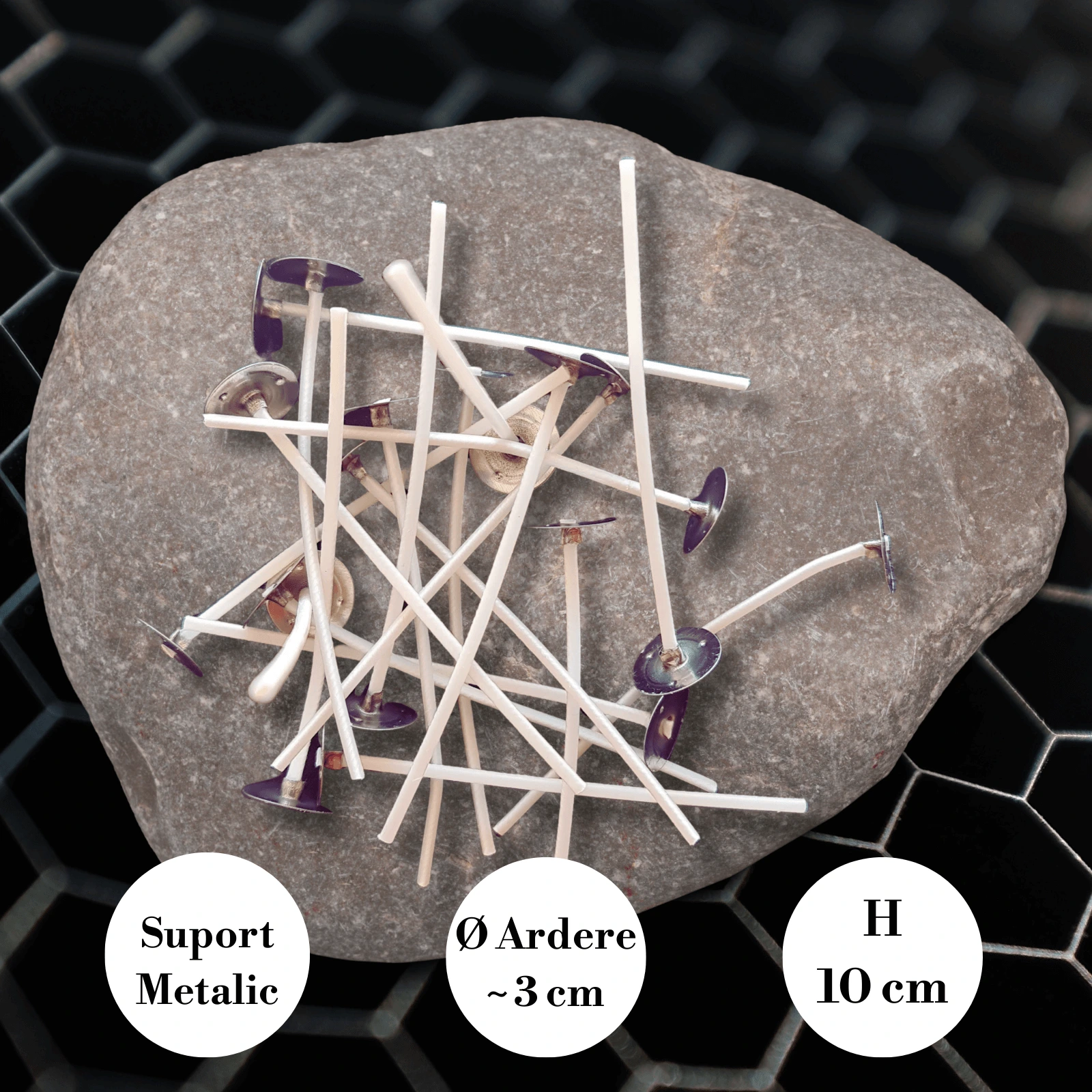 Modelul 30 / 10 cm este calibrat pentru diametre orientative de ~3 cm, dar cu lungime mai mare, pentru a asigura stabilitatea flăcării în recipiente mici și înalte.
