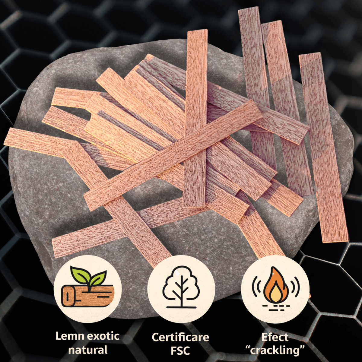 Fitilurile din această gamă sunt realizate din lemn exotic de esență tare, selectat pentru stabilitatea sa în ardere.