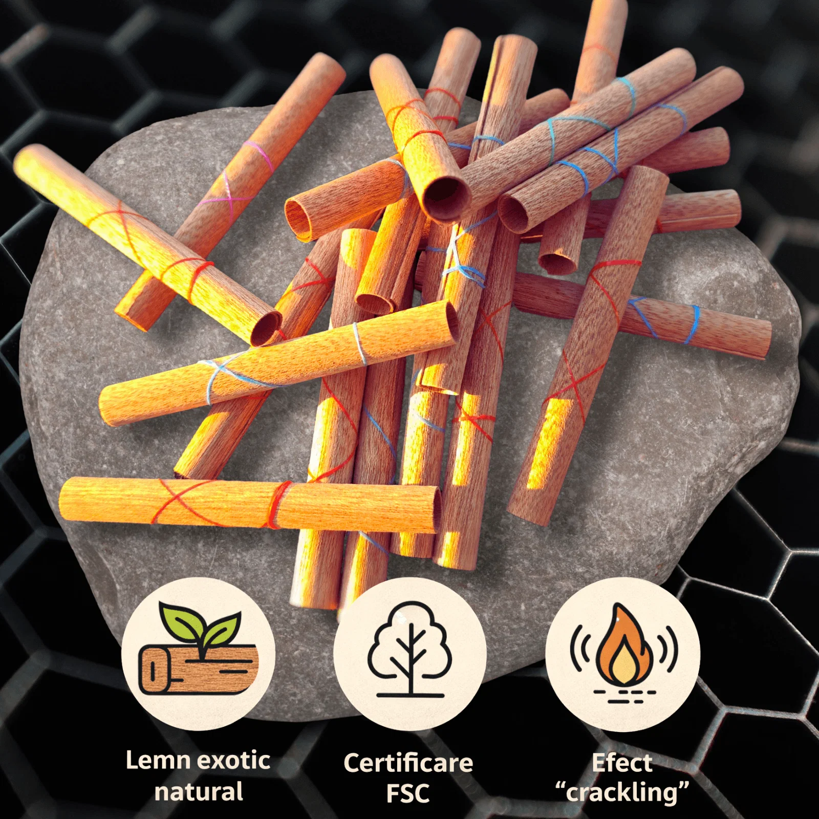 Lemnul este un material natural, iar structura fibrei, uleiurile naturale și umiditatea materialului (aprox. 6–10%) pot varia ușor. Aceste diferențe pot influența dimensiunea flăcării sau viteza de ardere.